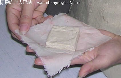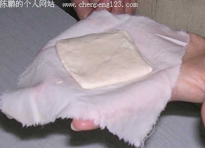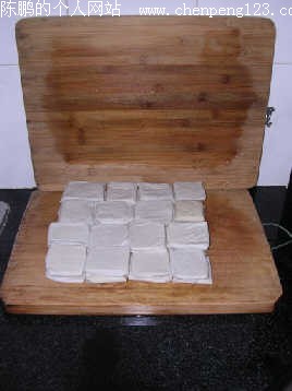 四、用木板压上,压上重物压一整夜后,豆腐里的水份已经差不多榨干,取出来打开看看,可以看出来豆腐已经压得很结实了,这样做出来的臭豆腐质地会非常细腻。