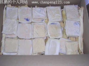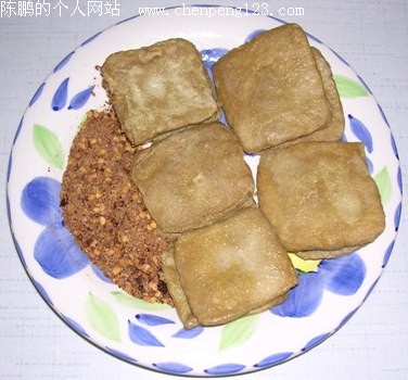 七、拣出来,去掉白布,放煎锅里用少量油小火煎,煎至两面金黄即可。煎好的臭豆腐配上椒盐辣椒面,呵呵,闻起来有点臭,可吃起来好香啊!