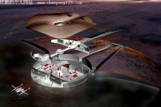按照设计,太空港选址在低地,将自然状态下的地势作为护堤,主要依赖太阳能维持供热和冷却系统运行,使用光电板来发电,同时拥有水循环设施。一个起伏不平的混凝土外壳起到屋顶的作用,透过大块玻璃,跑道和飞船一览无遗。