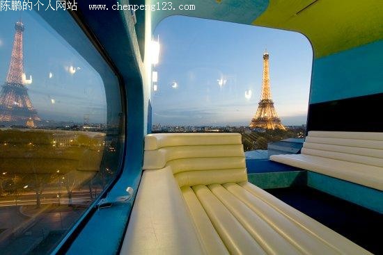 现在,这家移动酒店来到了浪漫之都--巴黎。它在2007年10月至2008年底将成为巴黎的独特一景。由于座落在巴黎“东京中心”的屋顶,位置之高可以将艾菲尔铁塔和巴黎市景尽收眼中。当然,游客同样可以白天参观、晚上住宿休息。