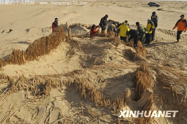 2008年12月2日,科考队员在一处废弃的罗布人房屋旁工作。当日,罗布泊综合科学考察队首席科学家夏训诚研究员率队造访三河口冲积扇上芦苇屋。作为罗布人迁徙生存的一处遗址,这里的兴衰足以见证塔里木河历史的变迁。