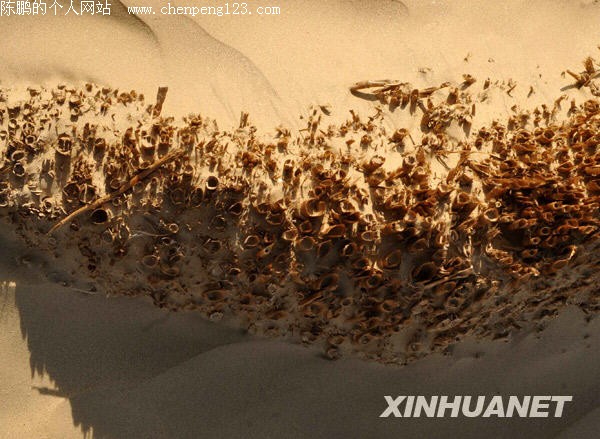 密密匝匝的芦苇根留下了大湖里曾有密不透风的芦苇荡的痕迹。当年风起时必是苇叶摇曳、苇絮纷飞;如今风起,只是尘扬沙流。芦苇根止不住沙丘的移动,即便是罗布人当年为安乐窝编造的密实的芦苇墙,在风与沙的夹击下,也只能勉强留下了依稀的家居轮廓。
