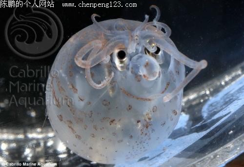这只快乐的胖鱿鱼学名为helicocranchia pfefferi,是一艘远洋捕捞船在洛杉矶和卡特琳娜岛之间的太平洋水域捕获的。“笑面鱿鱼”有一个鳄梨般大小,是在水下100米深处被发现的。鱿鱼习惯于让身体注满水,它们两眼后面具有生成光的器官。