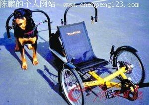 这辆狗拉踏板车看起来与老款的三轮摩托车相似:主人把狗用皮带套在踏板车一侧,用刹车和车把控制方向,通过狗跑时产生的动力拉动踏板车和狗主人。