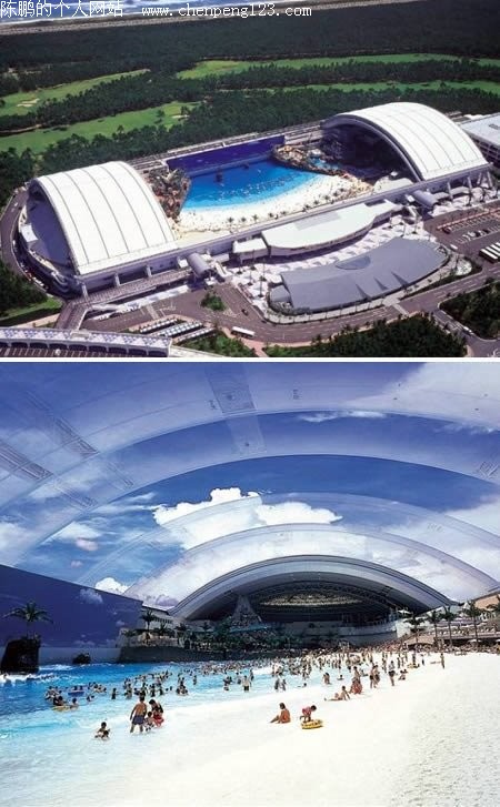 “海洋巨蛋”,位于宫崎县,它是世界上最大的室内游泳池。它长300米,宽100米,离海500米。馆内的温度始终保持在30摄氏度左右,它的屋顶为天蓝色,它甚至有云一样的图案。它有一个人造火山,也是一个人造波浪发电系统。