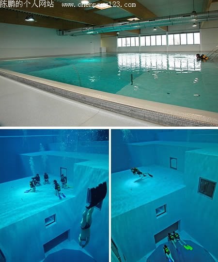 沿布鲁塞尔环城高速路南行,在18号出口处不远,有一座蓝灰相间的建筑,不高的房顶上铺满太阳能热水器蓄热板。这里就是2004年6月刚开始启用的世界上最深的室内游泳潜水池“尼莫33(NEMO33)”,如今是布鲁塞尔潜水学校所在地。 敞亮的玻璃窗内,泳池10米见方,池边摆满橙黄色的氧气罐瓶。池中部水色湛蓝,一个直径6米的深井中翻腾着阵阵气泡。许多戴氧气面罩、脚登蛙蹼的潜水者正在33米深的水下漫游,体验潜水极限乐趣。