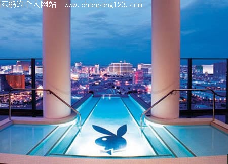 在拉斯维加斯,新休海夫纳天空别墅棕榈在塔顶有一个花花公子游泳池。游泳池在里面,whirlpool在外面。这个游泳池占地两亩,有一个DJ,露天音乐会,三个吧台,27个小屋,还有一个32英寸电视机、冰箱和风扇。