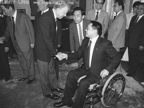 1987年6月29日,当时已经卸任的前美国总统吉米卡特到访北京,和邓小平的儿子中国残联主席邓朴方握手。虽然卡特任内没有能够访华,但他卸任后8次来到中国。