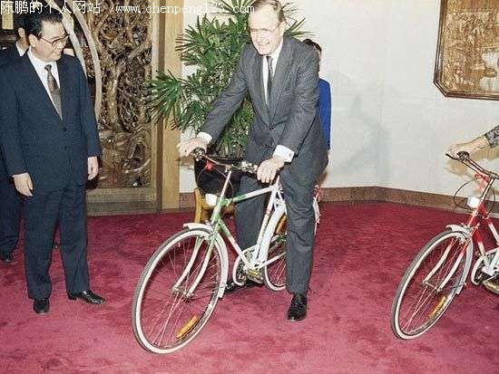 1989年2月25日,时任美国总统老布什访华期间骑自行车感受中国文化