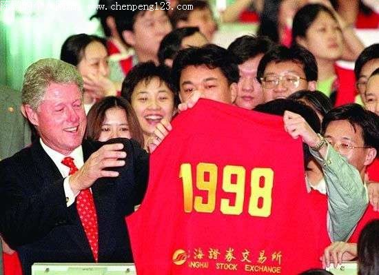 1998年7月1日,时任美国总统克林顿访华期间在上海证券交易所受赠一件印有编号1998的场内经纪人红马甲