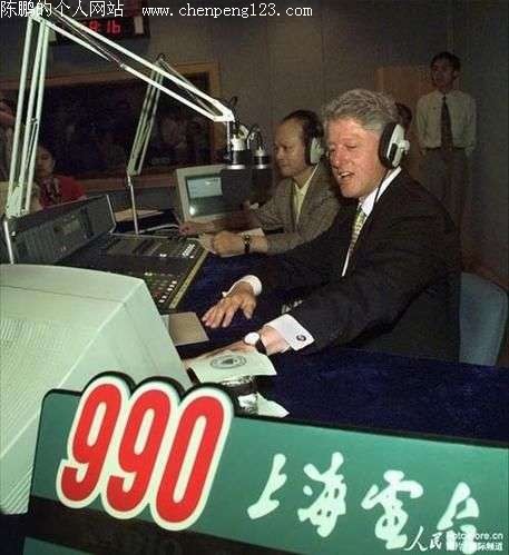 1998年6月30日,美国总统克林顿到访上海,参与上海电台“市民与社会”的谈话节目,回答市民提问。旁边是主持人左安龙