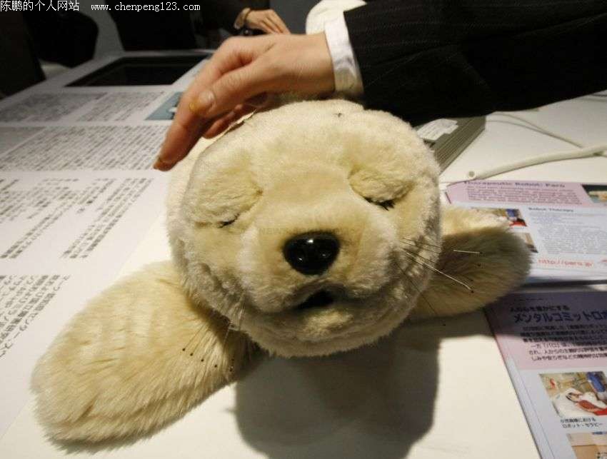 一个被制成海豹外形的治愈类机器人,该机器人可以模仿宠物的动作对人们的抚摸进行回馈。