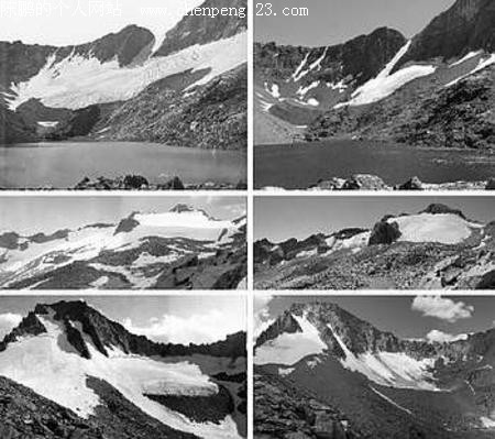 三组对比照片展示了内华达山脉冰川令人吃惊的消退情况。从上至下的冰川分别为达纳冰川(拍摄于1883年8月和2004年9月8日)、莱尔冰川(拍摄于1903年8月7日和2003年8月14日)以及达尔文冰川(拍摄于1908年8月14日和2004年8月14日)。内华达山脉的绝大多数较小冰川均位于北部或者面朝东北的斜坡上,明媚的加州阳光无法与它们直接接触。然而,不断升高的气温将最终敲响这些美国最南端冰川的丧钟。