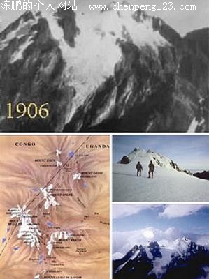 非洲有近一半的冰川冰被禁锢在冰冻的河流中。一个多世纪之后,有超过半数的冰川冰消失,有冰的山只剩下3座,冰面积只有区区0.6平方英里(约合1.5平方公里)。过去100年来,鲁文佐里山脉最高峰——斯坦利山上的埃琳娜冰川呈现出戏剧性萎缩状态,过去几十年的消退速度加快,达到令人担忧的程度。