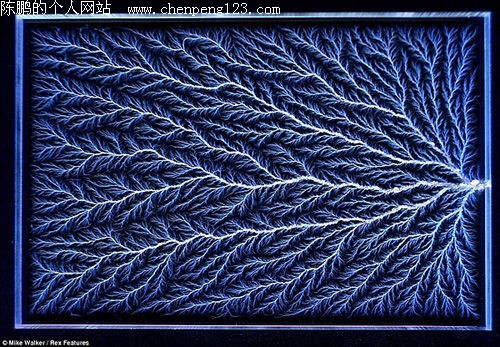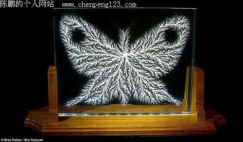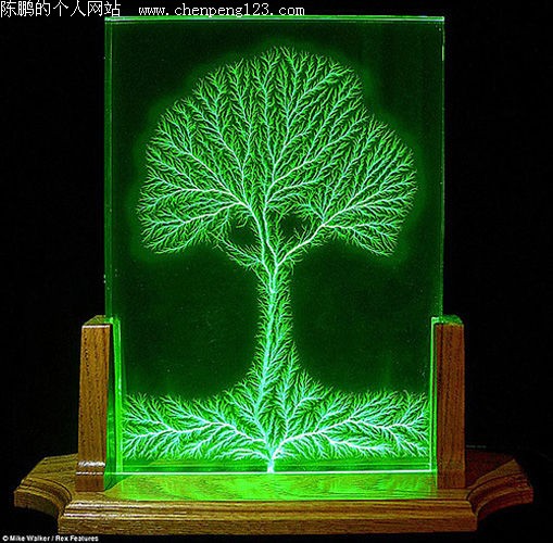 美国伊利诺伊州雕刻家波特·赫克曼,用500万伏的粒子加速器对着玻璃板轰出完美图案,如同将闪电冻结在冰块中似的。