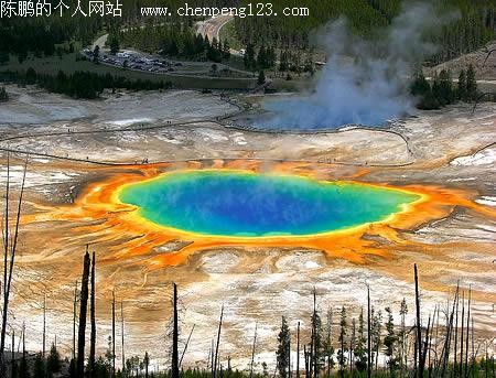 位于黄石国家公园的大稜镜温泉,又称大虹彩温泉,是美国最大,世界第三大的温泉。它宽约75至91米,49米深,每分钟大约会涌出2000公升,温度为71°C左右的地下水。它的美在于湖面的颜色随季节而改变,春季,湖面从绿色变为灿烂的橙红色,这是由于富含矿物质的水体中生活着的藻类和含色素的细菌等微生物,它们体内的叶绿素和类胡萝卜素的比例会随季节变换而改变,于是水体也就呈现出不同的色彩。在夏季,叶绿素含量相对较低,显现橙色、红色,或黄色。但到了冬季,由于缺乏光照,这些微生物就会产生更多的叶绿素来抑制类胡萝卜素的颜色,于是就看到水体呈现深绿色。