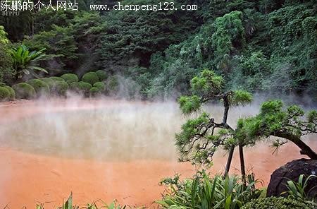 血池温泉是日本别府知名的“地狱”温泉。其壮观的景象使得慕名前来的人们驻足欣赏,忘记此处乃是洗浴场所。从图上不难发现它的奇特之处,那就是泛着血红色的泉水,好似想象中地狱的景象,而这种红色全得益于水体中富含的铁元素。