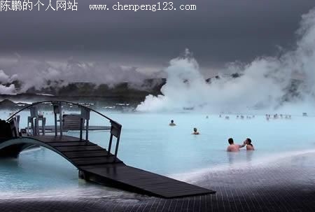 冰岛西南部,距离首都雷克雅未克大约39公里的蓝湖地热温泉,是冰岛最大的旅游景点之一。蓝湖所在地是地球上地下岩浆活动最为频繁的区域之一,这种活动加热了蓝湖,使得水体蒸腾。地面附近的熔岩流加热的水蒸汽用于推动涡轮机发电,经过了涡轮机的蒸汽变成热水,经过换热器又为市政热水供暖系统提供热量,可谓一举多得。蓝湖洗浴和游泳的礁湖地区水温平均在40 ℃ 左右,水体有丰富矿物质,如硅和硫,在蓝湖泡温泉,可以帮助治疗一些皮肤疾病,如牛皮癣等。