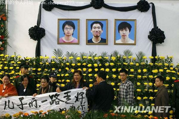 2009年10月28日,荆州市为三位大学生举行追悼会,市民们献上写有“儿子们,一路走好”的条幅。新华社发 (陈卓 摄)