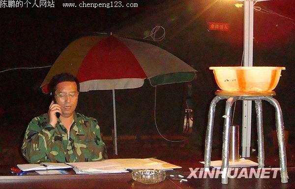 2009年7月13日,山东与四川两地,同时为一个人设立了灵堂。这个人名叫崔学选,生前是山东潍坊市建设局局长、山东省援建北川工作指挥部新县城建设组组长。他是积劳成疾病倒在任务繁重艰巨的援建第一线的。在生命的最后时刻,崔学选还惦记着要回到北川去看一看。他未能实现自己的遗愿,但他用生命托起了北川这片灾难土地上的希望!这是崔学选在抗震救灾一线办公,打电话调度板房建设。他身边放着盛有杀虫剂的水盆用来诱杀蚊虫(资料照片)。新华社发