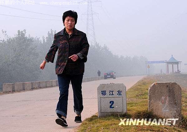 这是“暴走妈妈”陈玉蓉行走在武汉的长江江堤上(2009年10月23日摄)。新华社发 (陈勇 摄)