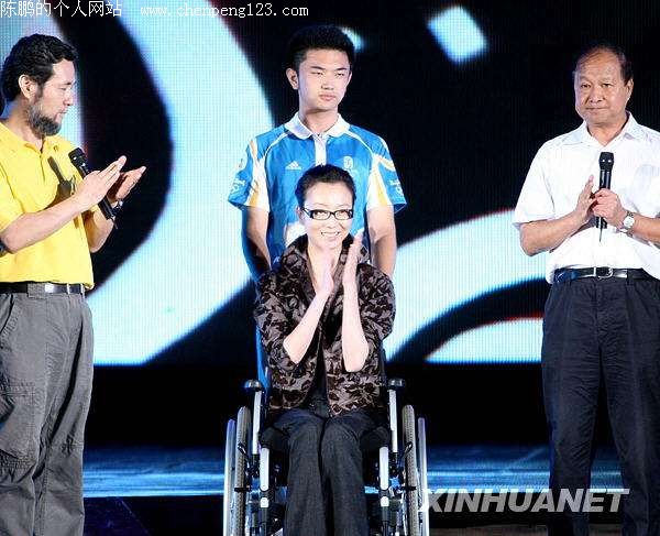 这是已瘫痪的刘岩(坐轮椅者)在北京举行的“纪念北京奥运会成功举办一周年音乐会”上接受观众的祝福(2009年8月6日摄)。新华社记者 陈建力 摄