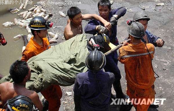 2009年7月12日,在贵州晴隆煤矿透水事故救援现场,救援人员将被困25天后奇迹生还的矿工抬出井外。新华社发