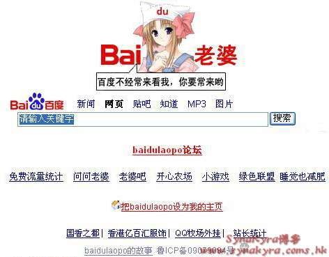知道百度,但你知道百度的老婆是谁吗?近日,一个名叫“百度老婆”的网站让大家跌破眼镜。该网站主页上醒目的标识“百度老婆”是由“baidu”、“老婆”与动画形象3个图案拼凑而成。主页还给动画形象加了一句雷人旁白:“百度不经常来看我,你要常来哟”。