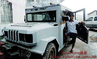 一说到“悍马”,人们马上会想到那拥有“越野之王”美誉的庞然大物,可浏阳文家市镇文华村28岁的花炮机械设计师杨伦伟,着迷于“悍马”的彪悍外形,突发奇想,与徒弟一起造出了一辆“山寨悍马”,惹得周围邻居连连称奇。