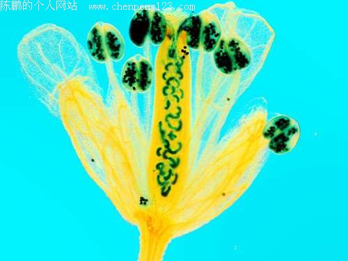 在这张图片中,花粉颗粒、子房和花粉管都被染成墨绿色。由于特殊成像技术的应用,背景呈蓝色,花瓣和萼片呈现黄色。