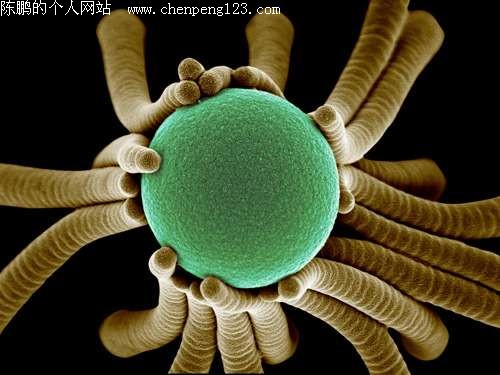去年,哈佛大学一个工程师团队发现,将聚合物毛浸没在液体中,随后液体蒸发,聚合物毛就会呈现螺旋结构。这张经过数字处理增色的图片显示,聚合物毛形成的螺旋结构直径尽管只有250微米,甚至能够紧紧抓住小球体,需要时也可以将之释放。