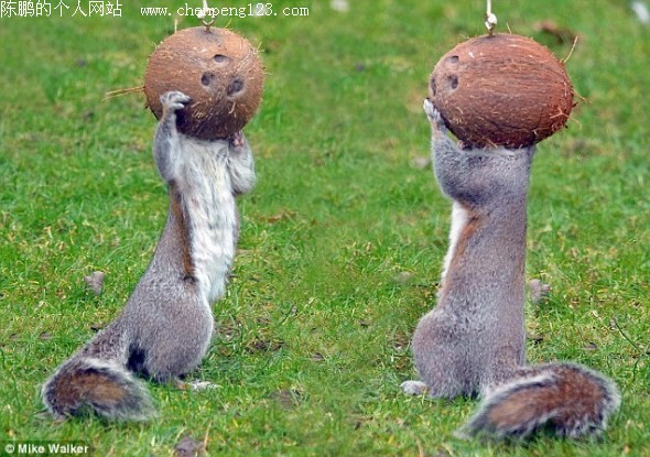 这对松鼠是简-罗伯特兹位于英国汉普郡费勒姆的花园的常客。花园主人罗伯特兹已经将椰子果肉挖出供它们享用,但它们似乎并不知足,仍然各自抱着一个椰子壳,头伸进其中贪婪地啃下最后一丝美食。本来,这对贪婪的小家伙经常会来花园里偷食为鸟类准备的食物,但现在它们只对椰子壳感兴趣。