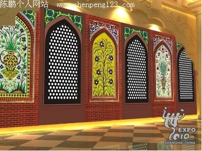 伊斯兰装饰风格伊斯兰装饰艺术源于“阿拉伯式图案”,其中,几何图案是伊斯兰装饰艺术的最重要标志,圆形、方形、菱形、多边形、星形等各种图形形成纹饰,与相对应的数字含义巧妙地编织在图案中,营造出错综、繁复、无止尽的视觉效果。巴基斯坦馆的内部装饰充分运用了该特点,营造了地道的异域风格。