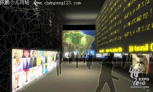 巴西馆的中央展厅是一个由4块长方形屏幕组成的全景舞台,每块屏幕的面积达到了48平方米。舞台的天花板和地面将别具特色,它们会配合播放与大屏幕上表现的城市有关的细节形象。当人们被宽大的主屏幕环绕时,脚下的地面上也会出现与主屏幕展示的城市相关的细节动态画面,比如巴西海滩上的沙子、科帕卡巴纳市的人行道,人们甚至可以在展馆中“横跨”一条正在流动的小溪。