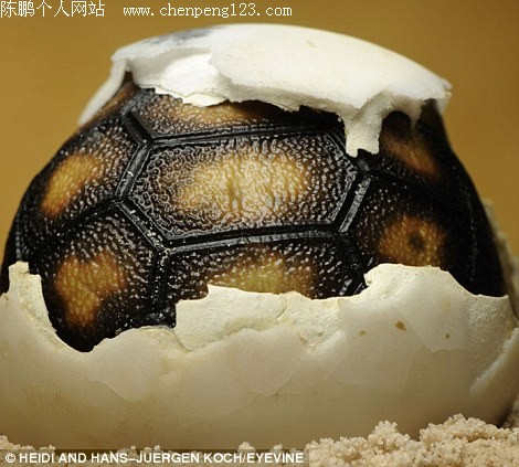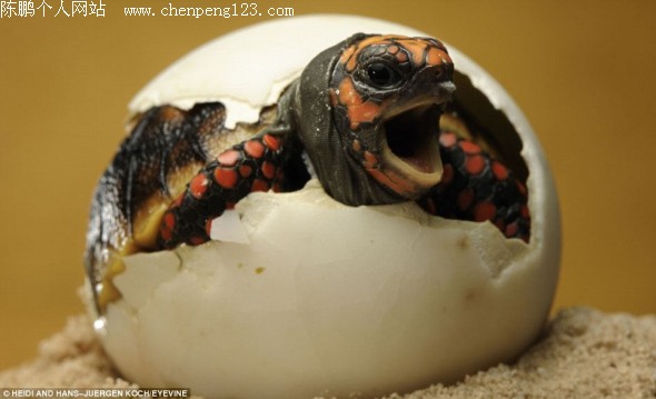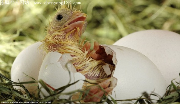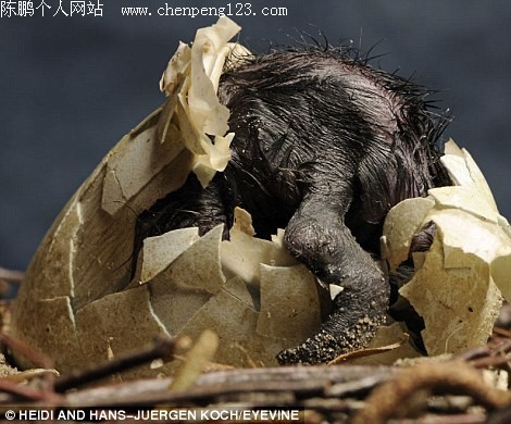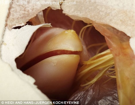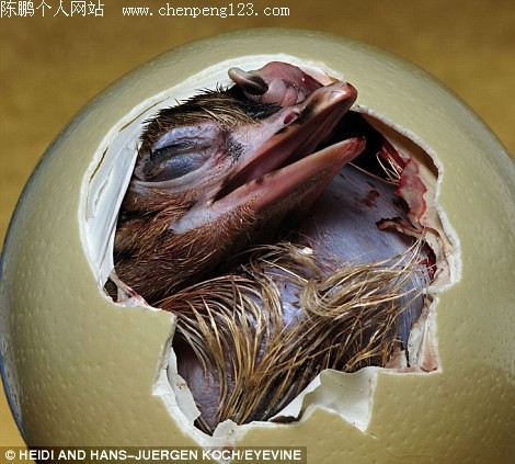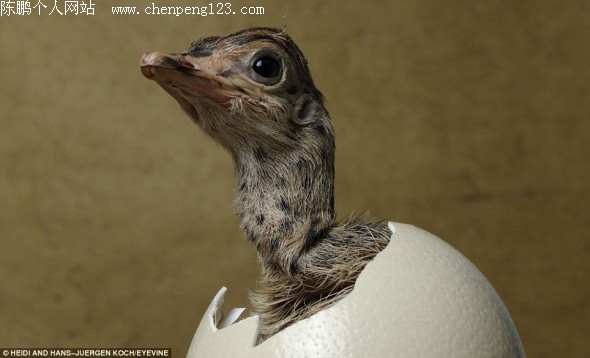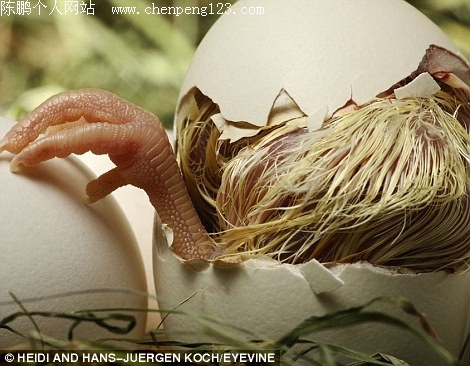 这一系列非常惊人的照片,展示了4种不同动物破壳而出的场面。这些被称作“逃进生命里(Escape Into Life)”的系列照片,记录了鸡、非洲企鹅(蛋产在填满羽毛和少量树枝的洞穴里)、鸵鸟(它不是用嘴把蛋壳啄开,而是通过扩展喉部的肌肉,把壳顶开)和一只红腿陆龟(这只小龟从壳里出来时嘴巴张得大大的,好像是被眼前的美景惊呆了)破壳而出的过程。