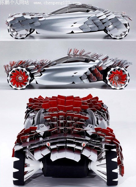 由德国普福尔茨海姆大学的一名毕业生设计的宝马乐简(Lovos)概念车采用了全新的造型,突破了传统的设计思路。虽然覆满鳞片的车身让它看起来像一头怪异的“铁甲豪猪”,但事实上,该车车身表面由260个结构片组成,这些结构片通过铰链固定在车身上,每个结构片都配备了太阳能电池,成为一个个可以独立转动的太阳能电池板,能最大限度的收集太阳能。当车辆处于静止时,每个独立的光电板还会随着太阳的移动方向转动。此外,车轮上也同样设计了独立的光电板,当车辆行驶时,这些光电板能重新组合成涡轮状。