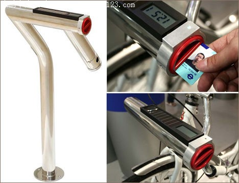 图4:特定停车处一般设在公车站附近,并安装了太阳能供电的RFID射频识别读卡器和电子锁,可以自动识别ID卡用户身份并帮助锁车和解锁功能,同时将在ID卡中记录骑自行车的能量贡献值。