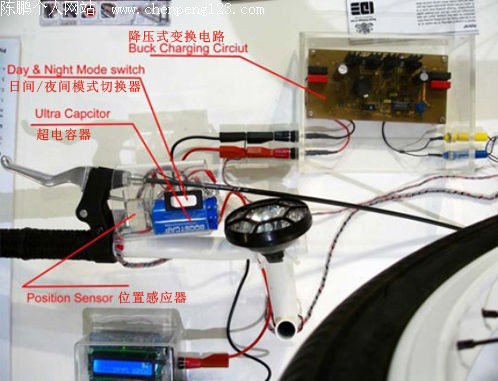 图3:该系统的核心技术是:“hybrake强力刹车”系统与超电容器(介乎电池和普通的电容器之间的电子工具,可以贮藏大量能源,并在短时间内循环充电及放电)结合,能让自行车在行驶和刹车减速过程中产生和储蓄更多的动能。