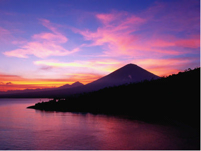 印度尼西亚巴厘岛活火山,又称巴厘峰。海拔3140米,为岛的最高峰,当地人奉为圣山。火山位于岛的东北部,喷发周期一般约50年。1963年的一次喷发是百余年来最猛烈的一次,热浪高达1万米 ,火山灰在4000 米高空弥漫全岛,人畜伤亡惨重。
