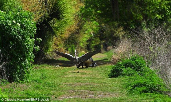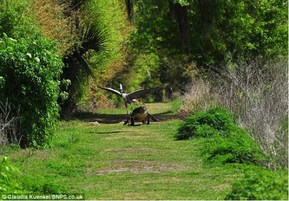 北京时间3月18日消息,在美国佛罗里达州波克县(Polk County)的一个自然保护区,46岁的摄影师克劳迪·昆克尔(Claudia Kuenkel)记录下了自然界罕见的一幕。一只苍鹭显然已经饿疯了,它竟然从一个鳄鱼巢里叼起了一条小短吻鳄。