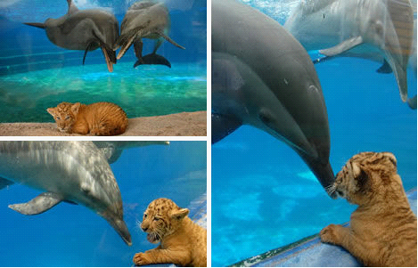 图中趴在玻璃边的小家伙是只仅有6周大的狮虎(liger)。它的爸爸是狮子,妈妈是老虎。据了解,狮虎是世界上最大的猫科动物,能长到12英尺长。然而,图中的这只幼狮虎却着实惹人怜爱。在深圳野生动物园(Shenzhen Safari Park),我们可以看到这样的景象:小狮虎和三只海豚隔着玻璃行碰鼻礼,它们是最好的朋友。鳍片和皮毛,水里和陆地,看似永远不会相关的两种动物,在此萌生了美好的友谊,没有时间、空间及种族的距离,这份友谊暖人心房。