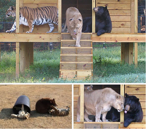 一只老虎、一只狮子和一只熊的组合不能不为之震惊。据悉,“三剑客”仅两个月大的时候就生活在了一起。他们是在一次毒品突袭行动中获救。当时主人把它们当做身份的象征。后来三个家伙一并住进了位于乔治亚州(Georgia)的诺亚方舟动物救助中心(Noah’s Ark animal rescue center )。八年后,这三只动物深信彼此就是自己的兄弟,其中的熊现在已有1000磅中,老虎希瑞·坎(Shere Khan)重350磅,狮子里奥(Leo)也重350磅。生活只是一种习惯,习惯了就是永恒。