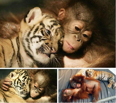 图中5个月大的猩猩和濒临灭绝的苏门答腊幼虎(Sumatran tiger )都被他们的母亲抛弃了。印尼动物医院把这两个小家伙放到了一块。或许是因为同命相怜,它们成了好朋友。图中他们惺惺相惜的表情,让人很心疼,却又会萌生出一种感动。