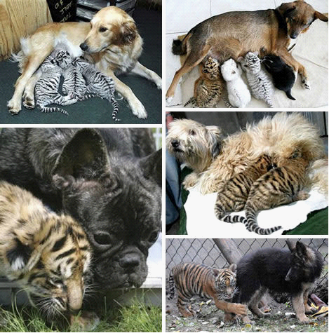 不知是什么原因,许多的狗都曾把幼虎当做它们自己的幼崽。据悉,在赣江(Kan)的野生动物园,有只黄色叫伊莎贝拉的母狗就收养了三只幼虎。无独有偶,在中国济南市跑马岭野生动物园(Paomaling Wild Animal World)三只新生的三胞胎幼虎被一只农场狗花妮收养。花妮曾经也做过幼虎的乳母。除此以外,在日本,一只法国斗牛犬变成了一只2周大的孟加拉虎的至交。还有一只在中国长春动物园的狗担当起了两只幼虎的乳母,而且显而易见的是,这两只幼虎和她并不相象。在波兰华沙动物园(Warsaw Zoo),3个月大的幼虎卓娅(Zoya)被母亲排斥,却与同龄的阿尔萨斯小狗(Alsatian puppy )做起了朋友。有时候,友谊是上帝开的一扇窗。