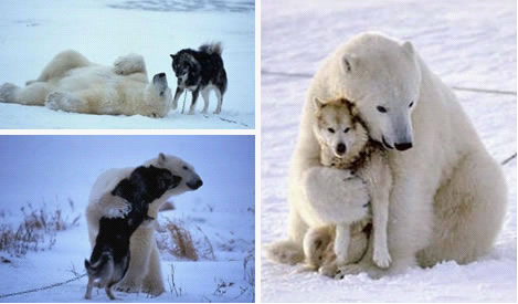 你是否考虑过收养一只狗?据悉,诺伯特·罗星(Norbert Rosing )捕捉到了一只1200磅重的北极熊与哈士奇雪橇狗嬉戏的画面。狗和熊的友谊成为了现实。这只哈德逊湾(Hudson Bay)北极熊并非首个与狗建立友谊的北极熊。你可以在右侧图中看到,北极熊正给一只雪地狼一个热情的拥抱。相逢是缘,珍惜才有友谊。
