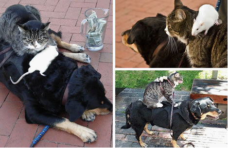 看过《猫和老鼠》的人都知道:猫抓老鼠,狗抓猫。然而现实是不是这样呢?让我们来看看这三只动物的友谊。一只老鼠骑在猫背上,猫又骑在狗背上,其乐融融。这不能不让人吃惊。而背后的故事是:狗狗布爵(Booger)把猫咪吉蒂(Kitty)养大,把吉蒂当成自己的孩子。而吉蒂又把小白鼠当成了自己的伙伴。这是一个需要多少爱和包容才能建立起的友谊啊!谈友谊,不说规则。