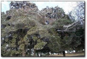 2007年,在美国田纳西州,这张罕见的巨幅蜘蛛网在公园里发现,据目击者声称,他们所见到的这张蜘蛛网起码有近80平米,结在一可近百年的老树上。能结成这么大的蜘蛛网在世界上都属罕见。