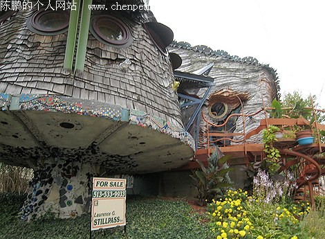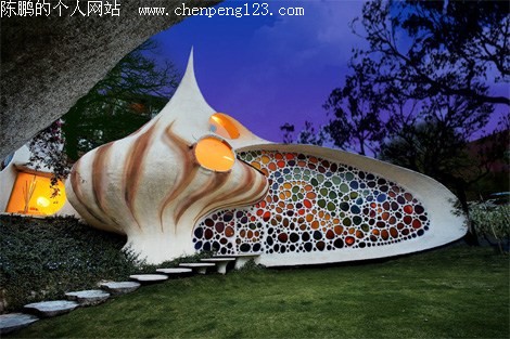 背景:这座像贝壳形状的房屋建造于2006年。一块块石板铺成的小路沿着灌木丛一直通向房屋的前门。房屋前的外墙壁上则镶嵌着各种图案。