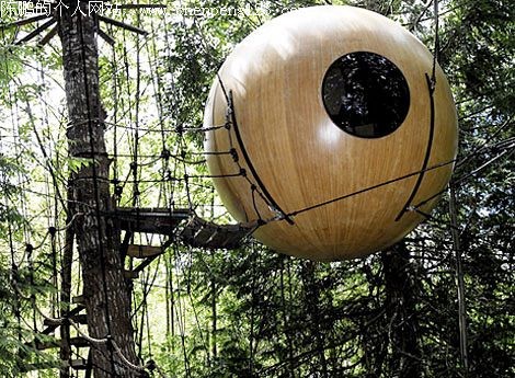 背景:这个悬挂于树上的房屋来自一对加拿大夫妇汤姆和罗茜的奇思妙想。他们希望能够将这种悬挂于空中的球形居住空间推荐给全世界的消费者。