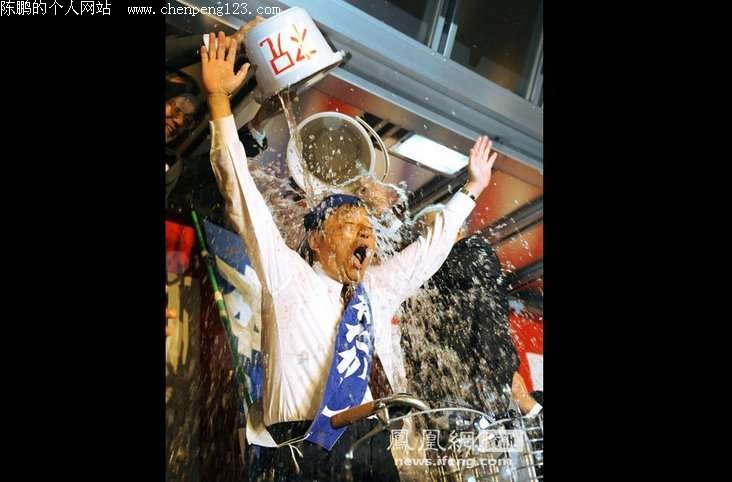 当地时间2009年4月26日,日本名古屋,在市长选举中获胜的前反对党议员河村隆被庆祝者当头浇了一桶水。